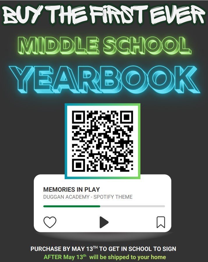 El equipo del anuario de 8.º grado ha estado trabajando súper duro este año para crear un anuario EXCLUSIVO para los grados 6-8. Eligieron el tema “Spotify” y este anuario será interactivo con la app de música Spotify.
