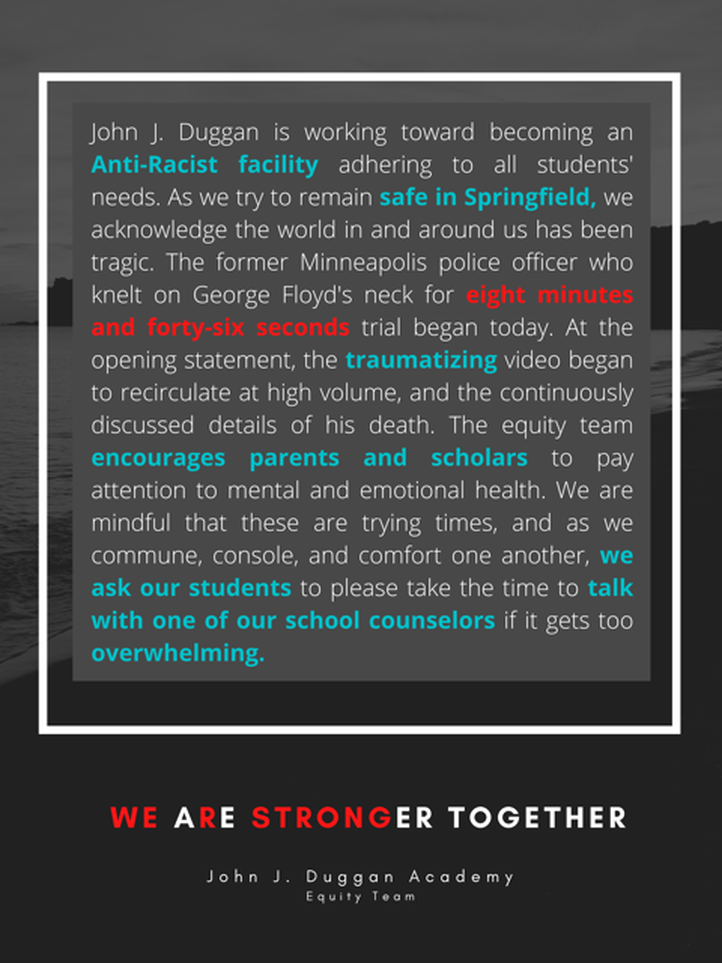 All three schools, Duggan, Kennedy and The Academy at Kiley, are part of the Empowerment Zone and are aligned in their beliefs with the commitment to being Anti-Racist within our institutions.
